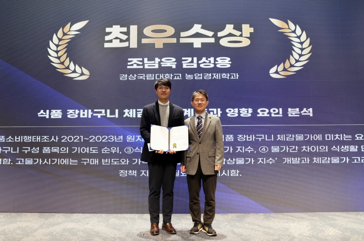 [뉴스스텝] 경상국립대학교(GNU·총장 권진회) 농업경제학과 박사과정 조남욱 씨가 12월 12일 서울 양재aT센터에서 열린 ‘2025 식품소비행태조사 활용 우수논문 경진대회’에서 ‘최우수논문상’(지도교수 김성용)을 수상했다.