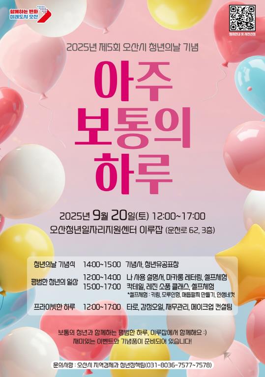 [뉴스스텝] 오산시는 법정기념일인 청년의 날을 맞아 오는 9월 20일 오산청년일자리지원센터 이루잡(운천로 62, 3층)에서 2025년 제5회 오산시 청년의 날 기념행사 ‘아주 보통의 하루’를 개최한다고 밝혔다.