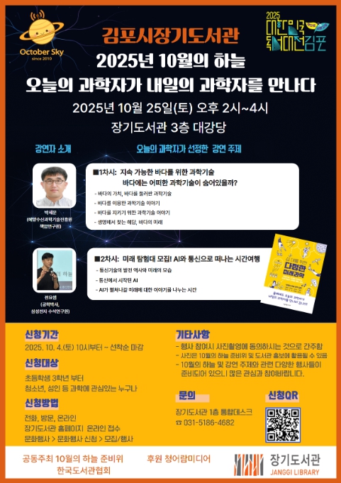 [뉴스스텝] 김포시 장기도서관은 10월 25일 오후 2시부터 4시까지 3층 대강당에서 김포시민을 대상으로 과학자들의 재능기부 도서관 과학 강연 '10월의 하늘: 오늘의 과학자가 내일의 과학자를 만나다'를 운영한다.
