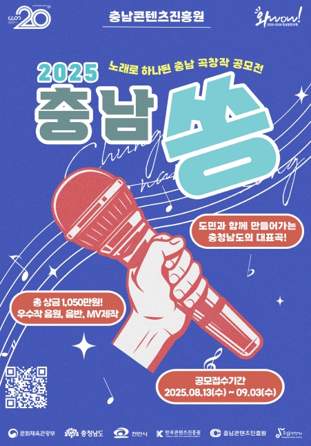 진흥원 김곡미 원장은 “이번 공모전은 단순한 음악 경연을 넘어, 충청남도의 문화적 자산을 음악이라는 장르로 재해석하는 시도”라며 “충남의 매력을 담은 창작 음악이 도민은 물론 전국에 널리 퍼질 수 있는 기회가 될 것”이라고 전했다.