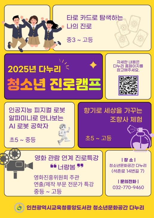 [뉴스스텝] 인천광역시교육청중앙도서관 청소년문화공간 다누리는 7월 26일 오후 1시부터 5시까지 청소년들이 적성과 흥미를 탐색하고 다양한 진로 분야를 체험할 수 있도록 ‘2025년 다누리 청소년 진로캠프’를 운영한다.