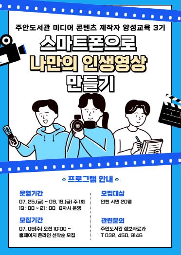 [뉴스스텝] 인천광역시교육청주안도서관은 오는 7월 25일부터스마트폰을 활용한 미디어 콘텐츠 제작자 양성 교육 프로그램 ‘스마트폰으로 나만의 인생영상 만들기’를 운영한다.