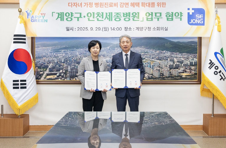 [뉴스스텝] 인천광역시 계양구는 9월 29일 인천세종병원(병원장 오병희)과 ‘다자녀 가정 병원진료비 감면 확대’를 위한 업무협약을 체결했다.