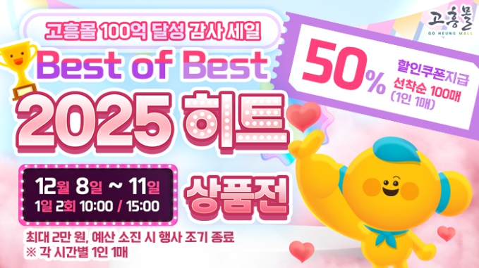 [뉴스스텝] 고흥군은 직영 온라인 농수축특산물 쇼핑몰 ‘고흥몰’이 누적 매출 100억 원 돌파를 기념해 오는 1월 8일부터 11일까지 ‘100억 달성 감사 세일–2025 Best of Best’ 기획전을 진행한다고 밝혔다.