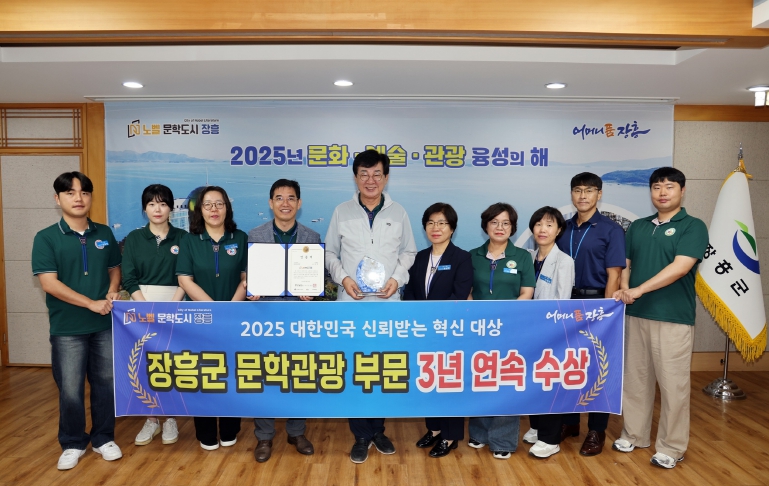 [뉴스스텝] 장흥군이 9월 29일 개최한 ‘2025 대한민국 신뢰받는 혁신대상’시상식에서 문학관광 부문 공공혁신 대상을 수상했다고 밝혔다.