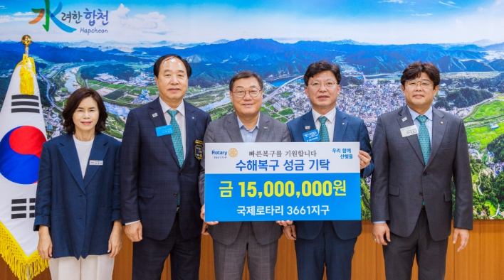 [뉴스스텝] 9월 22일 국제로타리 3661지구(총재 황인재)가 합천군청 군수실을 방문해 집중호우 피해 이재민들을 돕기 위한 성금 1,500만원을 기탁했다.