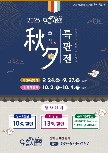 군 관계자는 “이번 추석 특판전을 통해 양양군의 우수한 농․특산물을 가족, 친지, 지인에게 전하며 따뜻한 마음을 나누는 기회가 되길 바란다”며, “앞으로도 고객 만족도 향상과 지역 농가의 소득 증대를 위해 노력하겠다”고 전했다.