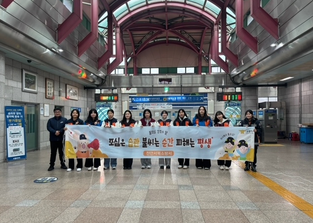 [뉴스스텝] 서북소방서(서장 김종욱)는 남서울대학교 119청소년단 학생들은 25일 성환역과 26일 남서울대학교 일대에서 ‘불조심 강조의 달’ 캠페인 홍보 활동을 펼쳤다고 26일 밝혔다. 남서울대 청소년단 학생들은 시민들에게 홍보물품을 나눠주며 주택용 소방시설 설치를 당부하고, 화재 예방의 중요성을 알리는 활동을 진행했다.