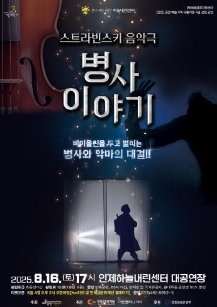 다음 날인 8월 16일 토요일 오후 5시에는 하늘내린센터 대공연장에서 러시아의 천재 작곡가 ‘이고르 스트라빈스키’의 음악극 ‘병사이야기’가 무대에 오른다. 이 작품은 제1차 세계대전 시기, 대규모 공연이 어려운 상황에서 시도된 소규모 형식의 걸작으로, 악기 연주와 이야기 낭독, 무용이 결합된 새로운 장르의 무대 예술이다. 20세기 가장 독창적인 클래식 작품 중 하나로 평가 받으며, 국내 무대에서는 ‘병사이야기’를 다루는 단체 중 유일하게 그림자극 형식을 접목해 선보인다.