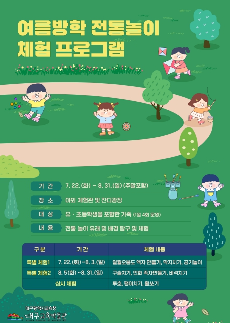 [뉴스스텝] 대구교육박물관은 여름방학을 맞아 7월 22일부터 8월 31일까지 약 6주간 유·초 학생과 가족들이 함께 즐길 수 있는‘여름방학 전통놀이 체험 프로그램’을 운영한다.