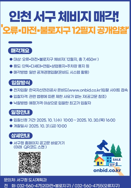 [뉴스스텝] 인천 서구는 오는 10월 1일부터 30일까지 오류, 마전, 불로지구 토지구획정리사업구역 내 체비지 12필지를 일반 공개경쟁 입찰(전자입찰) 방식으로 매각한다고 밝혔다.