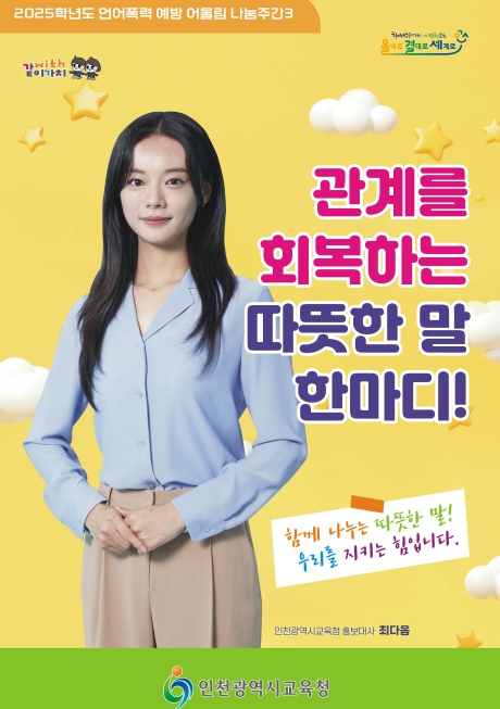 인천시교육청 관계자는 “언어폭력은 학생들의 정서와 학습, 대인관계에 큰 영향을 미친다”며 “이번 어울림 나눔주간이 서로 존중하며 긍정적으로 소통하는 계기가 되길 기대한다”고 말했다.