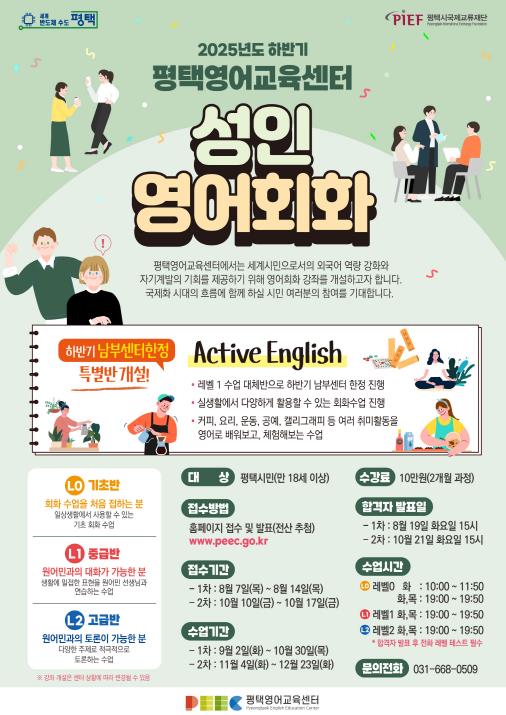 하반기 성인 영어 회화 프로그램 3기는 남부(팽성), 북부(장당), 서부(안중) 센터에서 각각 운영되며, 수강 신청은 8월 7일부터 14일까지 진행된다. 수업은 9월부터 2개월 과정으로 운영될 예정이다.