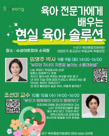 [뉴스스텝] 대구 수성구는 오는 9월 9일과 10월 15일, 총 두 차례에 걸쳐 수성아트피아 소극장에서 영유아 부모 600여 명을 대상으로 ‘육아 전문가에게 배우는 현실 육아 솔루션’ 특별강연을 개최한다.