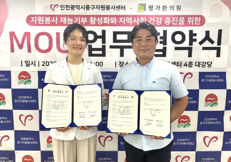 [뉴스스텝] 인천중구자원봉사센터(센터장 최윤호)는 지난 18일 명가한의원(원장 김서휘)과 중구자원봉사센터 4층 대강당에서 ‘자원봉사자 및 지역사회 건강 증진을 위한 업무협약’을 체결했다고 밝혔다.