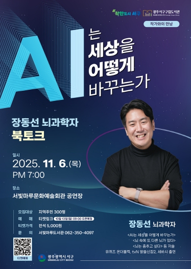 [뉴스스텝] 광주광역시 서구는 오는 6일 오후 7시 서빛마루문화예술회관에서 대한민국 대표 뇌과학자인 장동선 박사를 초청해 ‘특별 북토크’를 개최한다. 이번 북토크는 ‘AI는 세상을 어떻게 바꾸는가’라는 주제로 1부 강연과 2부 대담 프로그램으로 진행된다.