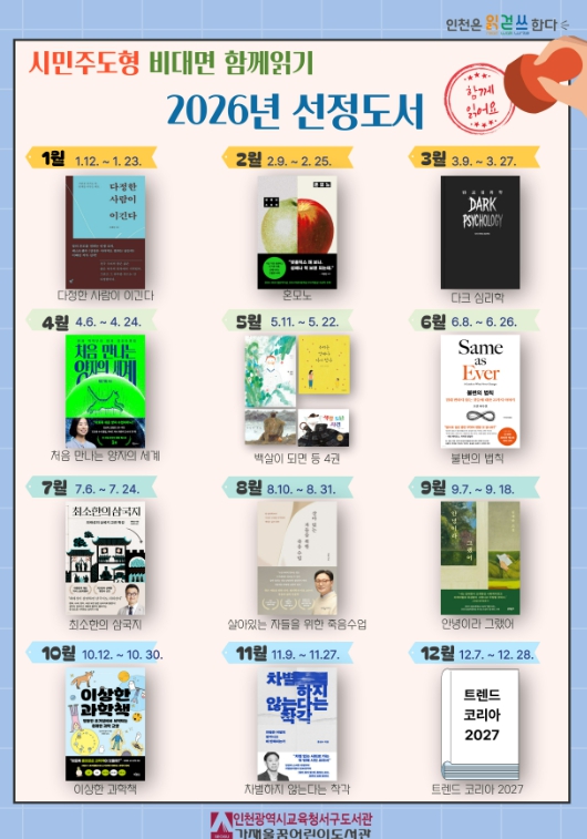 [뉴스스텝] 인천광역시교육청서구도서관은 12월 31일 ‘2026년 시민주도형 비대면 함께읽기’ 도서 15권을 선정·발표했다.