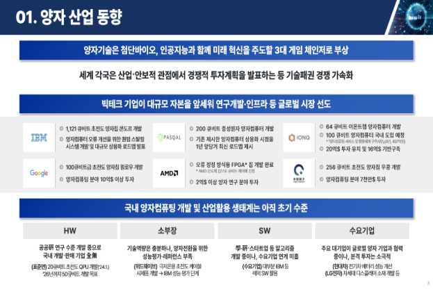 한편, 산업부는 양자기술 산업화 촉진을 위한 ‘양자기술 산업화 프로젝트’도 함께 발표했다. 이 프로젝트를 통해 초전도 QPU 패키징과 극저온 냉각기 등 핵심 소부장의 국산화를 본격 추진하고, 산업 현장의 난제 해결을 위한 양자 소프트웨어 개발과 검증을 단계적으로 확대해 나갈 계획이다. 또한, 양자–슈퍼컴퓨팅 결합형 플랫폼 구축과 산학 연계 실무 교육을 통해 기업이 직접 양자모델을 설계·활용할 수 있는 기반도 마련해나갈 예정이다.