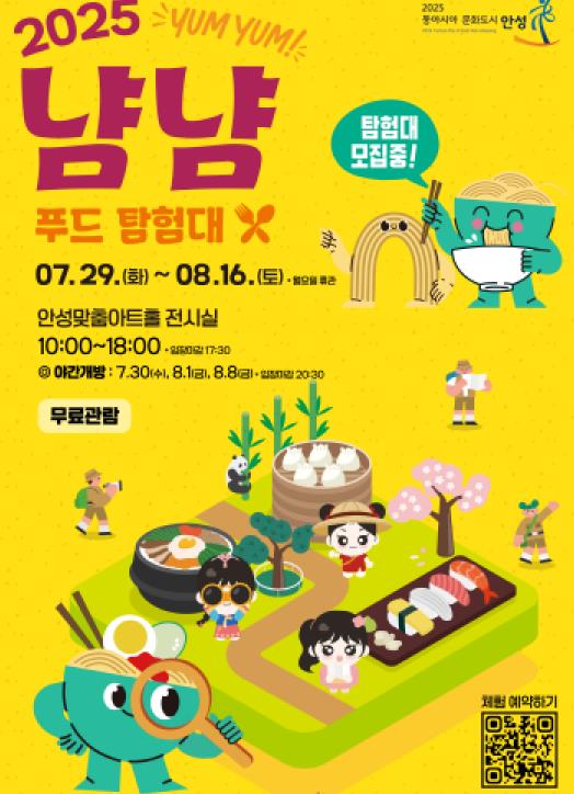 [뉴스스텝] 안성시는 오는 7월 29일부터 8월 16일까지 안성맞춤아트홀 전시실에서 2025 동아시아문화도시 특별전시 ‘2025 냠냠(YUM YUM) 푸드 탐험대’를 개최한다.