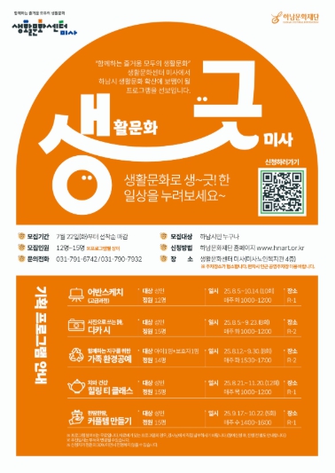 이번 ‘생활문화~ 긋!’의 자세한 내용은 하남문화재단 홈페이지를 통해 확인과 참여 신청이 가능하다. 참여비는 무료이며, 일부 프로그램의 경우, 재료비가 발생할 수 있다.
