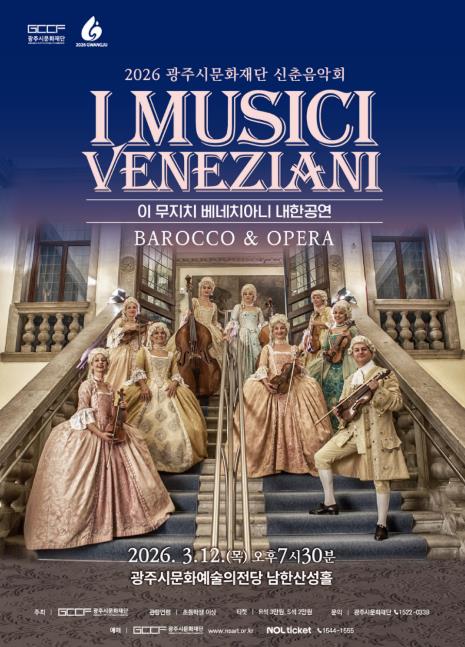 [뉴스스텝] (재)광주시문화재단은 2026년 신춘음악회로 이탈리아 베네치아니를 기반으로 활동해온 바로크앙상블 〈이 무지치 베네치아니(I Musici Veneziani) 내한공연 – Barocco & Opera〉를 개최한다. 이번 공연은 베네치아 황금시대의 음악과 문화를 무대 위에 생생히 재현하며, 관객들에게 클래식을 통한 특별한 시간여행을 선사할 예정이다.