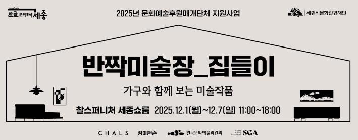 [뉴스스텝] 세종시문화관광재단(대표이사 박영국)은 세종화랑협회, (주)찰스와 함께 만드는 협업 전시 ‘반짝 미술장_집들이’를 12월 1일부터 7일까지 찰스퍼니처 세종 쇼룸에서 개최한다고 밝혔다. 이번 전시는 ‘집’을 주제로 한 공간형 전시이자, 지역 시각예술을 생활공간 속에서 자연스럽게 경험하도록 기획된 미술시장형 프로그램이다.