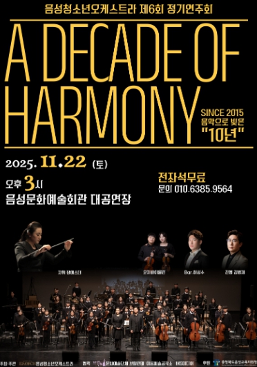 [뉴스스텝] 충청북도음성교육지원청의 방과후학교 민간공모사업 운영 단체인 음성청소년오케스트라(지휘 장에스더)가 창단 10주년을 맞이하여 오는 11월 22일 오후 3시, 음성문화예술회관 대공연장에서 제6회 정기연주회 ‘A DECADE OF HARMONY’를 개최한다.