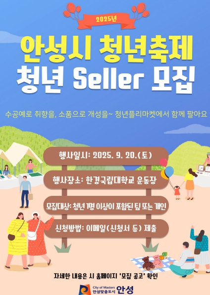 청년 셀러 모집과 관련한 자세한 내용은 안성시 홈페이지 공고문에서 확인할 수 있으며, 문의는 안성시 사회복지과 청년팀으로 하면 된다.