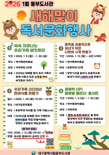 주요 행사는 ▲새해를 맞아 가족의 소망을 적어 트리를 꾸며보는 ‘쑥쑥 자라나는 우리 가족 버킷트리’. ▲겨울방학을 효율적으로 보내기 위한 ‘나만의 시계 만들기’, ▲2026년을 함께할 ‘우리 가족 반려식물 만들기’ 등이다.