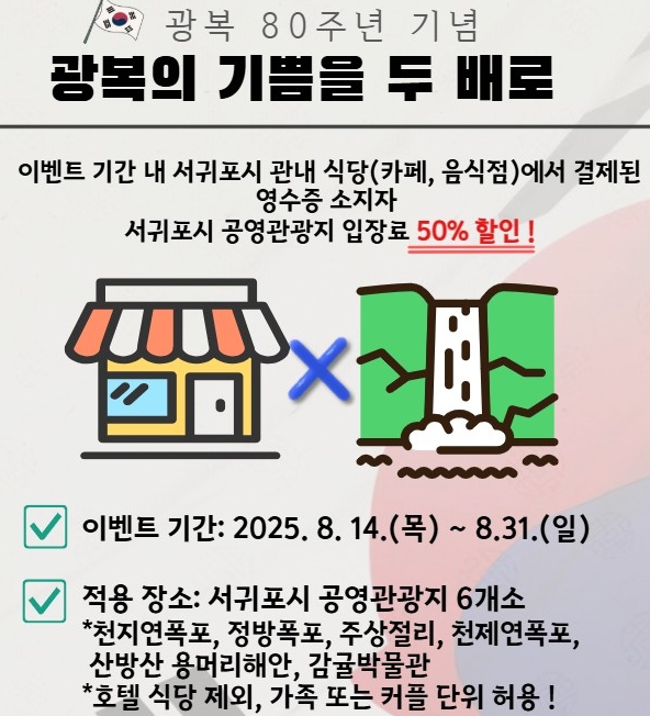 [뉴스스텝] 서귀포시는 광복 80주년을 기념하여 8월 14일부터 31일까지 서귀포시 소재 음식점 영수증을 지참한 방문객에게 입장료 50%를 할인하는 특별 할인 행사를 진행한다.