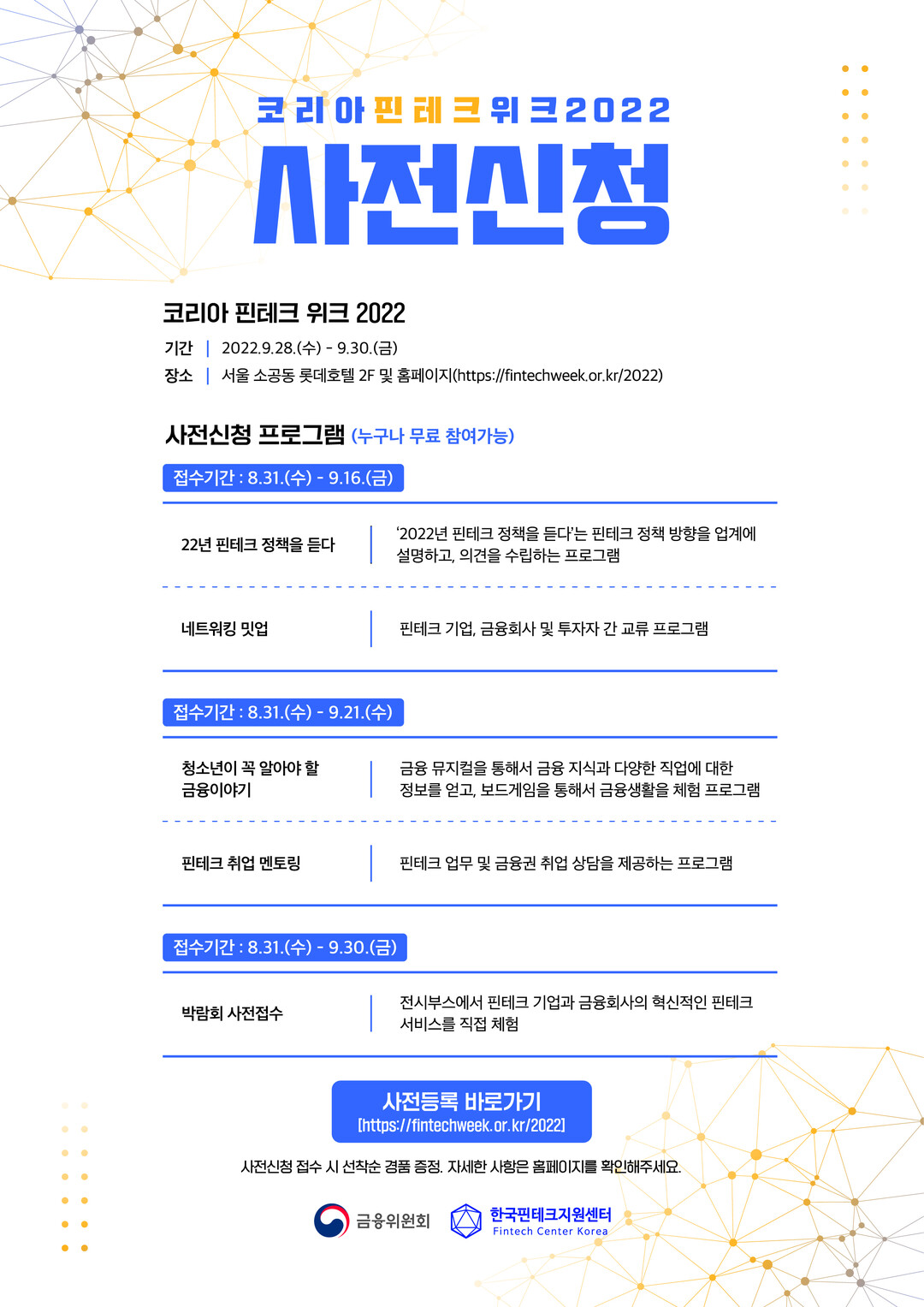 행사 관련 자세한 사항은 코리아 핀테크 위크 2022 홈페이지에서 확인할 수 있다.