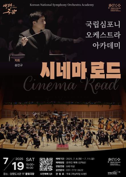 국립심포니오케스트라아카데미의 '시네마 로드'는 7월 19일 토요일 양평도서관 물빛극장에서 오후 3시에 진행된다, 공연은 전석 무료로 8세 이상부터 관람할 수 있으며, 공연시간은 약 60분이다. 사전 예매는 7월 8일부터 7월 11일까지 양평문화재단 공식 누리집을 통해 가능하다.