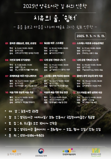[뉴스스텝] 김포시 양곡도서관이 오는 9월 3일부터 11월 13일까지 통합 치유 인문학 프로그램 '치유의 숲, 쉼표'을 선보인다. 올해 ‘길 위의 인문학’ 공모 선정에 따라 추진되는 이번 과정은 산림치유, 예술활동, 명상을 묶은 체험형 커리큘럼으로, 지역 주민에게 깊이 있는 휴식을 제공할 예정이다.