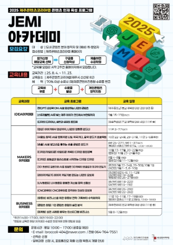 [뉴스스텝] 제주특별자치도와 (재)제주콘텐츠진흥원은 문화체육관광부, 한국콘텐츠진흥원과 협력하여, 지역 콘텐츠 인재 양성을 위한 교육 프로그램 '2025 JEMI 아카데미'를 본격 운영한다.