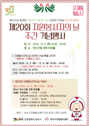 [뉴스스텝] 인천광역시 연수구자원봉사센터에서는 오는 12월4일 자원봉사자의날 20주년 기념식을 연수구청 지하 아트홀에서 개최한다고 밝혔다. 이날 ‘20년의 나눔을 넘어 미래로 이어갈 20년의 행복’을 주제로 열릴 기념식 행사는 지난 20년간 지역사회 곳곳에서 묵묵히 헌신해온 자원봉사자들의 발자취를 돌아보고 앞으로의 20년을 향한 새로운 비전을 공유하기 위해 마련된다.