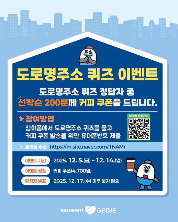 [뉴스스텝] 거제시는 12월 5일부터 도로명주소 온라인 퀴즈 이벤트를 진행한다고 밝혔다.