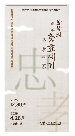 [뉴스스텝] 구미성리학역사관은 12월 30일부터 2026년 4월 26일까지 밀양박씨 경주부윤공파 기탁자료 특별전 『봉곡의 충효세가』를 개최한다.