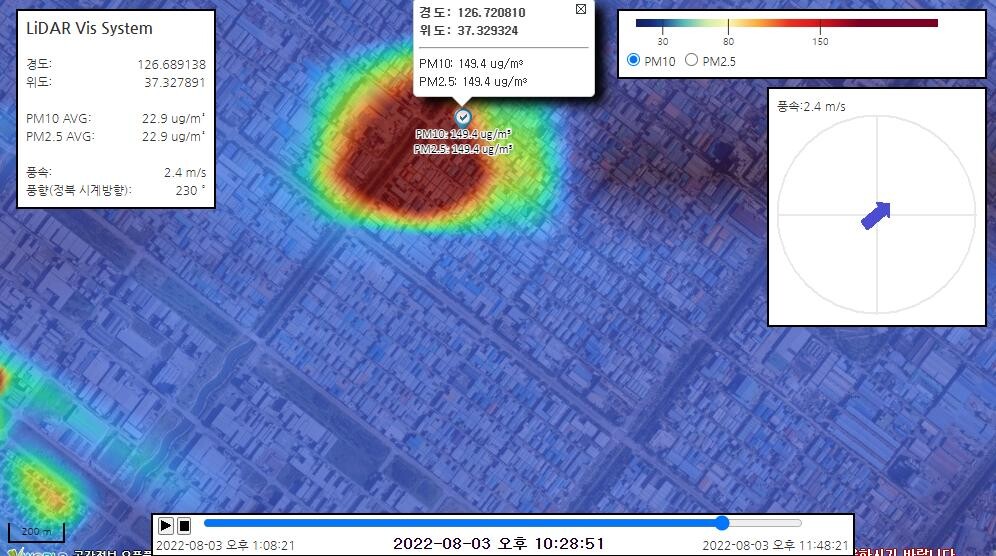 미세먼지 스캐닝 라이다는 관측 거리 반경 5km, 360° 스캐닝, 공간분해능 30m, 관측 주기 30분 이내로, 축구장 1만1000여 개에 달하는 면적을 측정할 수 있으며 약 1만 개의 IoT 간이측정기를 사용하는 것과 같은 효과를 가지고 있는 것이 특징이다.