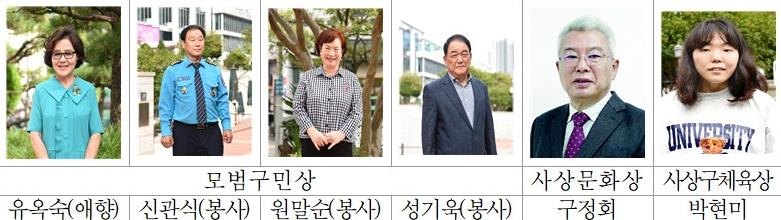 봉사부문 성기욱 학장동 주민자치위원회 부위원장은 1997년부터 현재까지 새마을지도자학장동협의회에서 방역 활동, 사랑의 집 고쳐주기, 환경 취약지 정비, 김장 김치 나누기, 어르신 삼계탕 나눔 등 다양한 활동으로 지역을 위해 봉사해 왔다.