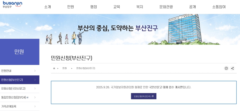 [뉴스스텝] 국가정보자원관리원 화재로 국민신문고 시스템 장애가 지속되는 가운데 부산진구는 민원 불편을 최소화하고자 구청 홈페이지에 ‘민원신청(부산진구)' 창구를 10월 10일부터 운영하고 있다고 밝혔다.