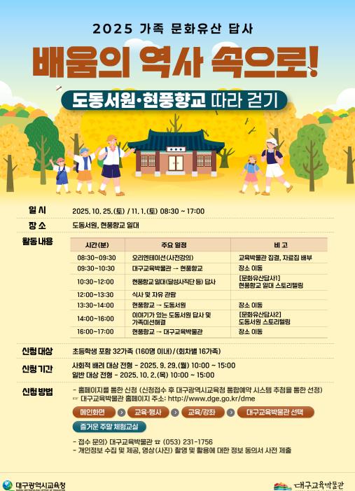 9월 29일부터 대구교육박물관 누리집을 통해 회차별 16가족을 모집하며, 기타 궁금한 사항은 교육학예부로 문의하면 된다.