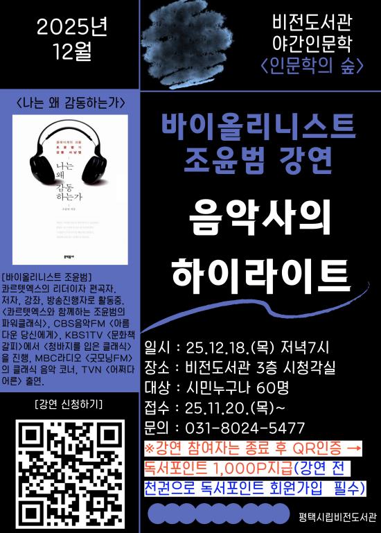 [뉴스스텝] 평택시립 비전도서관이 오는 12월 18일 저녁 7시 조윤범 바이올리니스트를 초청하여 ‘음악사의 하이라이트’를 주제로 야간 인문학 강연을 진행한다.