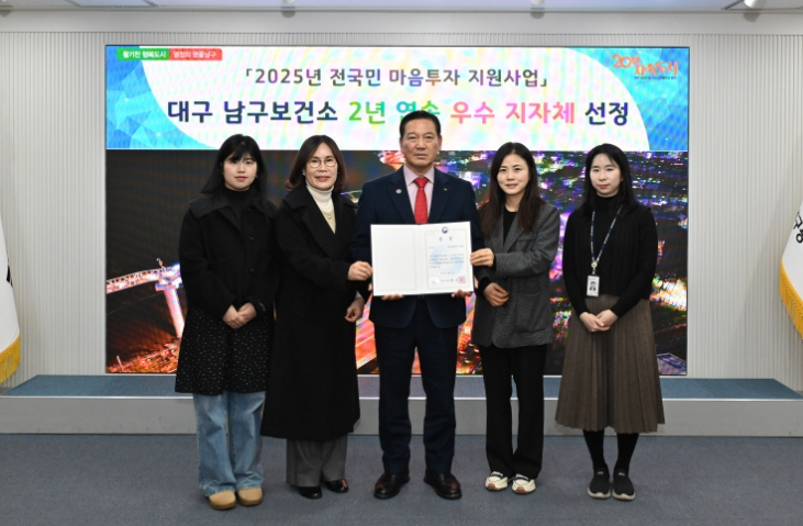 [뉴스스텝] 대구 남구가 보건복지부가 주관한 ‘2025년 전국민 마음투자 지원사업 유공자 및 우수지자체 포상’에서 2년 연속 우수상을 수상했다.