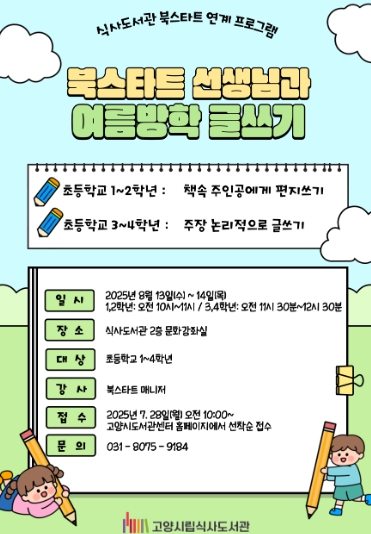 ‘북스타트 선생님과 여름방학 글쓰기’프로그램은 8월 13일, 8월 14일 이틀 동안 오전 10시부터 11시(1~2학년), 11시 30분부터 12시 30분(3~4학년)까지 식사도서관 2층 문화강좌실에서 진행된다.