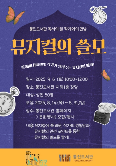 이번 프로그램은 '뮤지컬의 쓸모'를 집필한 흰제비나비(필명) 작가가 뮤지컬에 대한 깊이 있는 강연을 선보인다. 작가는 오랜 시간 뮤지컬을 사랑해온 애호가로, 뮤지컬이라는 예술 장르에 빠지게 된 계기와 그로 인해 책을 집필하게 된 과정, 그리고 뮤지컬이 우리에게 왜 ‘쓸모’ 있는 예술인지에 관한 이야기를 나눌 예정이다.