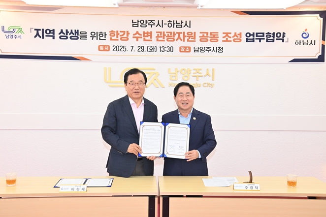이현재 하남시장은 29일 남양주시청에서 주광덕 남양주시장과 만나 ‘지역 상생을 위한 한강 수변 관광자원 공동 조성 업무협약(MOU)’을 체결했다.