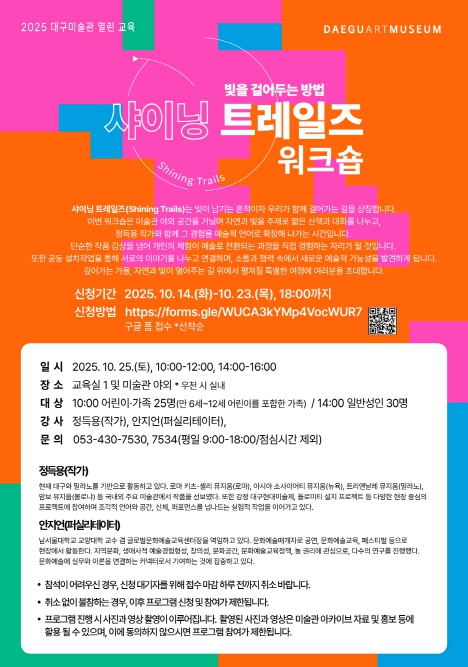 [뉴스스텝] 대구문화예술진흥원 대구미술관은 오는 10월 25일, 오전 10시, 오후 2시, 총 2회에 걸쳐 열린 교육 ‘샤이닝 트레일즈 워크숍: 빛을 걸어 두는 방법’을 운영한다.