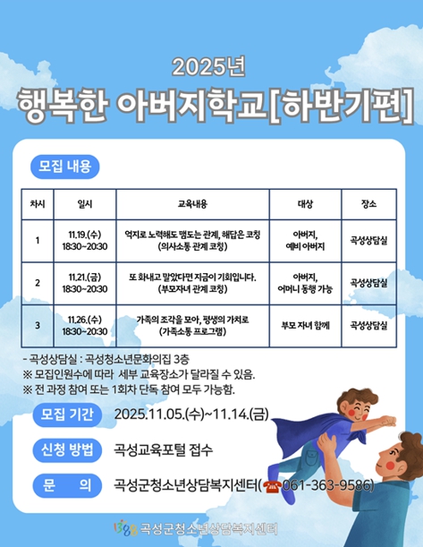 [뉴스스텝] 곡성군청소년상담복지센터가 지역 사회 아버지들(지역 청년회 등)의 요구 분석을 통해 가족 내 소통 역량 증진을 위한 부모교육 프로그램 ‘행복한 아버지학교’ 제10기 참가자를 모집한다고 10일 밝혔다.