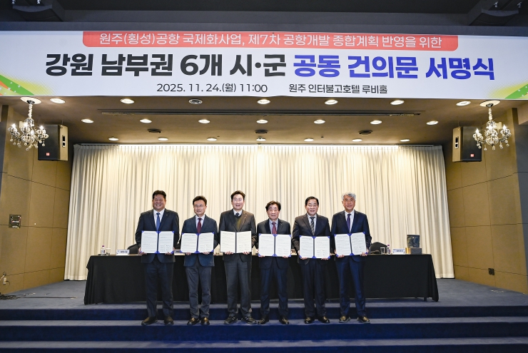 이날 서명식에는 원강수 원주시장, 김명기 횡성군수, 이상호 태백시장, 최명서 영월군수, 심재국 평창군수, 최승준 정선군수 등 강원 남부권 6개 시군의 시장·군수가 모두 참석해 원주(횡성)공항 국제화 추진에 뜻을 모았다.