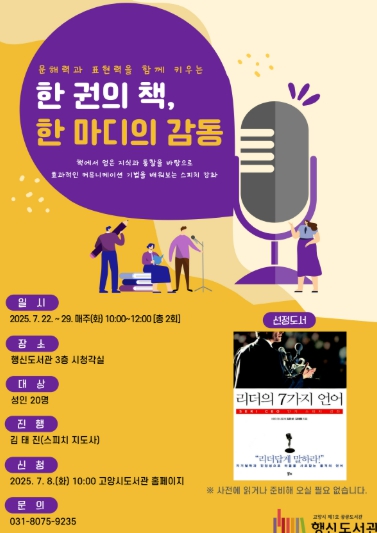 프로그램은 스피치 지도사 김태진 강사가 진행하며 7월 22일, 29일 오전 10시 행신도서관 시청각실에서 운영된다.